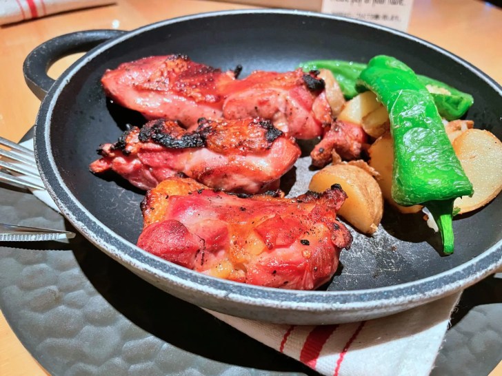 燻製されたチキングリルです!目の前まで燻製された皿で提供されるのでかなり映えるはずです。